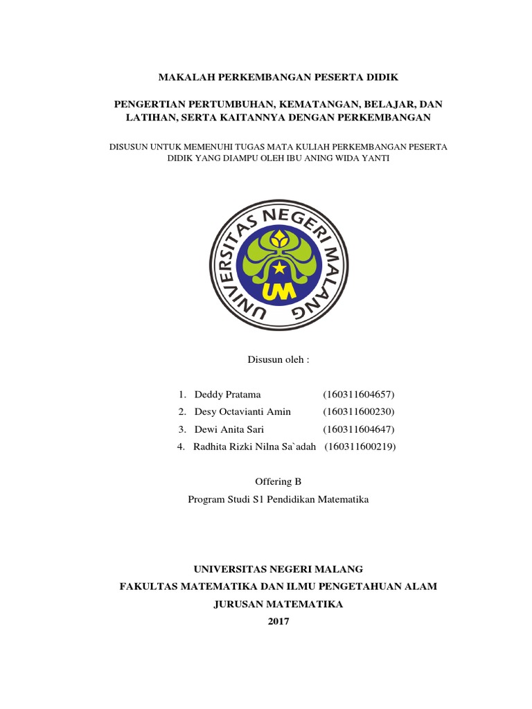 Tugas Mata Kuliah Perkembangan Peserta Didik : Tugas Mata Kuliah Perkembangan Peserta Didik Masnurul - Perkembangan peserta didik, semester 1,.. Jika saudara mengalami kesulitan di dalam memahami tugas ini, segera menghubungi dosen untuk mendapatkan penjelasan yang diperlukan. 24 universitas negri malang fakultas ilmu sosial (fis)jurusan pendidikan geografitahun 2011/2012 daftar isi daftar isi. Tugas individu ppd + pedoman makalah. Universitas nusantara pgri kediri 2 0 1 0 Perkembangan peserta didik kelas :