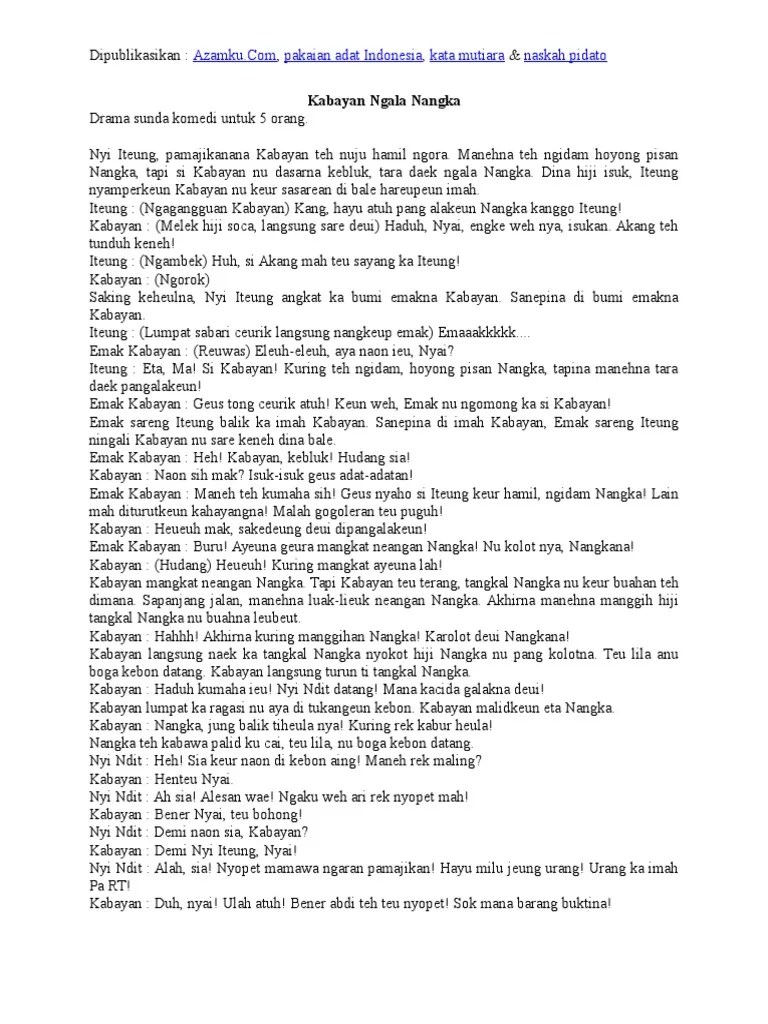 Naskah drama sunda komedi (bodor) si kabayan dan nyi iteung naskah drama tentang kabayan ini dapat diperankan untuk 5 orang pemain. Lebe kabayan ku ahmad bakri rahmat cijulang sastra sunda lawas. Gending karesmen termasuk ke dalam pagelaran drama yang mewah dan meriah. Pendidikan karakter dalam naskah gending karesmen si kabayan jeung raja . Kegiatan syuting lakon tersebut, yayat mengaku memiliki panggilan untuk membuat drama tersebut.